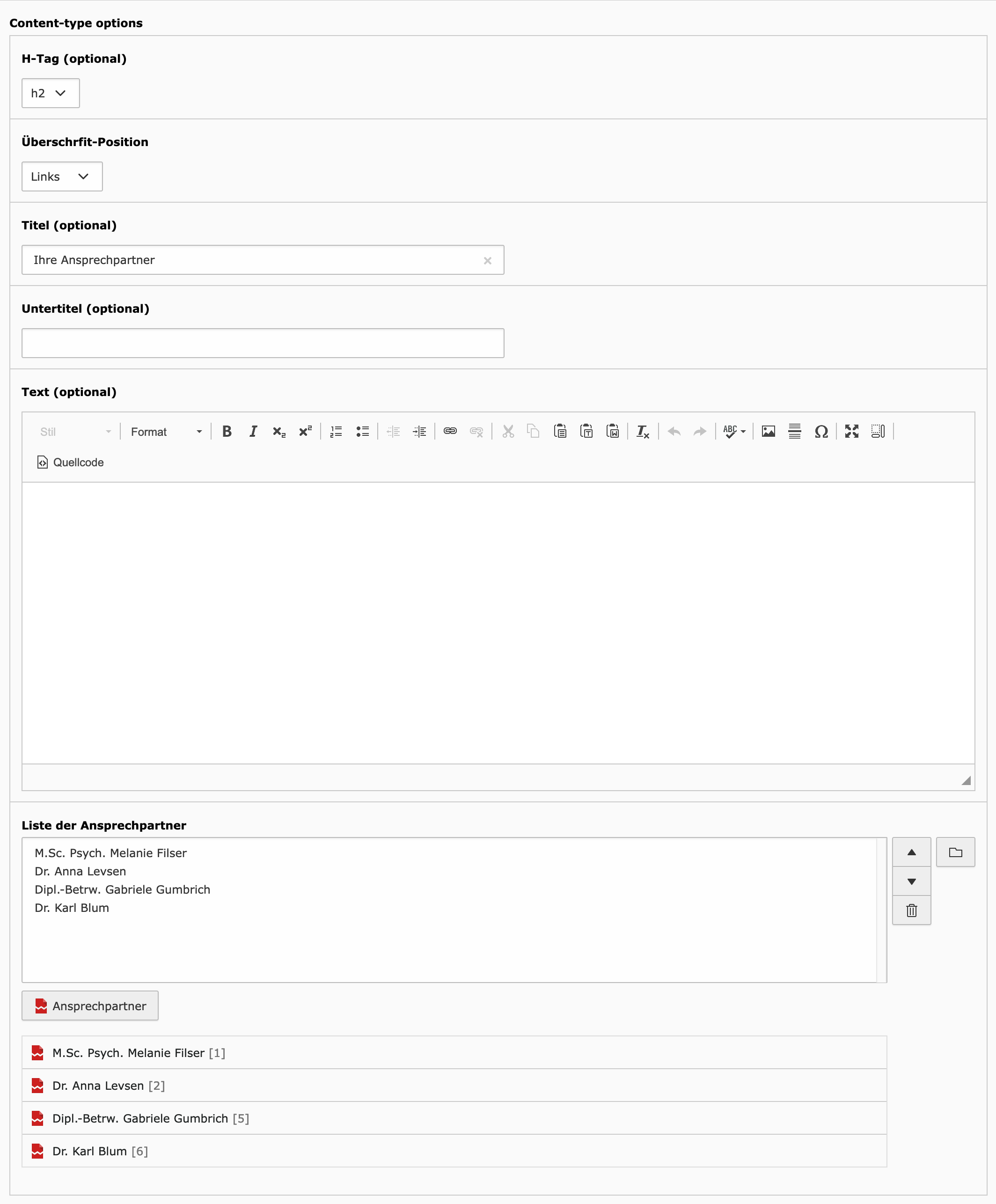 Mit diesem Element können Sie einen oder mehrere Ansprechpartner auswählen zur Ausgabe der Kontakdaten auf der Website. Die Ansprechpartner werden nicht in diesem Modul, sondern zentral in den Datensatzordnern unterhalb von"Ansprechpartner" gepflegt.