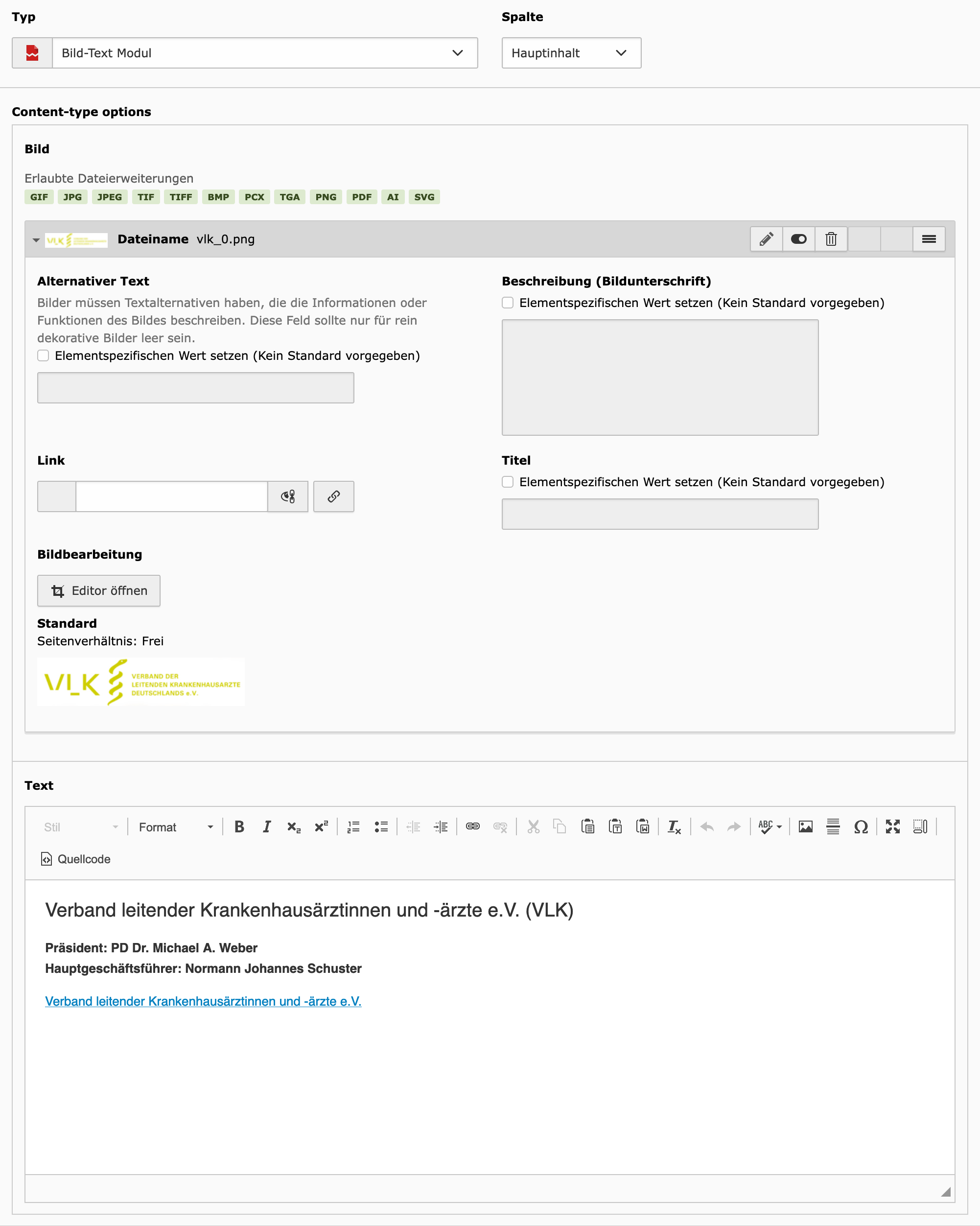 Zur Pflege eines 2-spaltigen Moduls mit einem kleinen Bild auf der linken Seite und Text auf der rechten Seite.