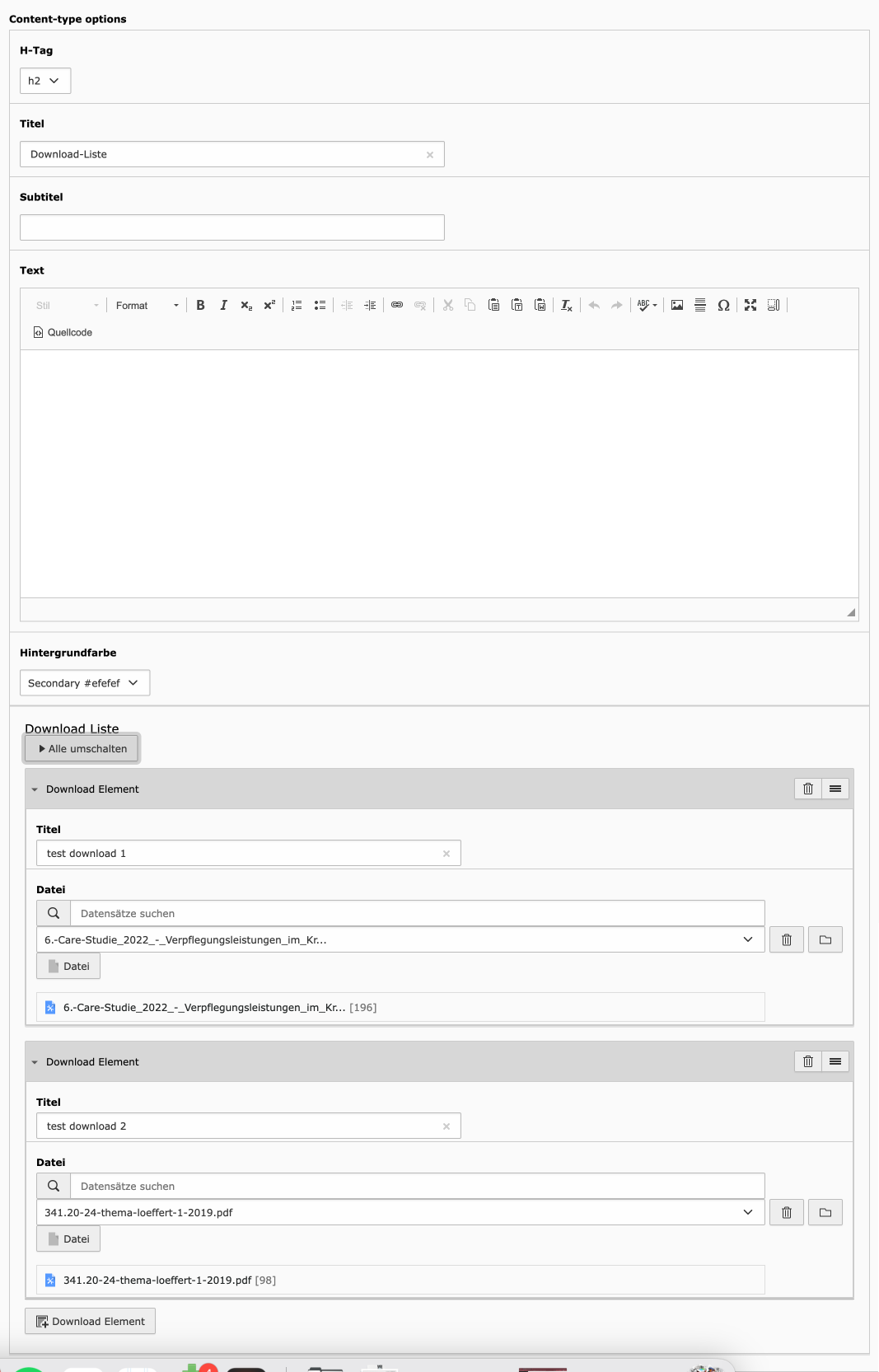 Die Dateien können Sie im unteren Reiter "Download Liste" hinzufügen. Klicken Sie hierfür auf den Button "+ Download Element". Über das ☰-Symbol können Sie die Einträge per Drag and Drop verschieben.