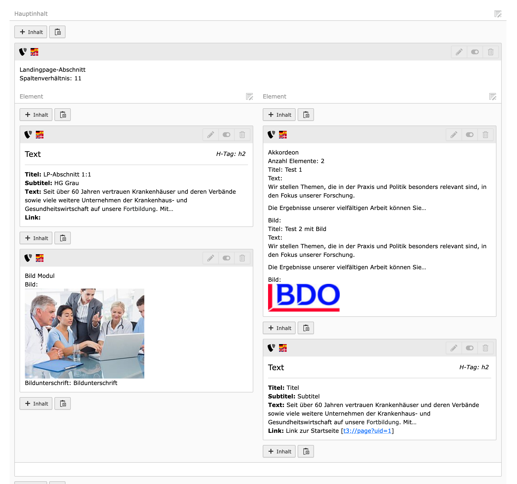 In der Seitenansicht können Sie Inhalte in der linken oder rechten Spalte des Landingpageabschnitts hinzufügen. Klicken Sie dazu auf den Button "+ Inhalt". Sie können die Inhaltselemente auch nachträglich zwischen oder in den Spalten verschieben.