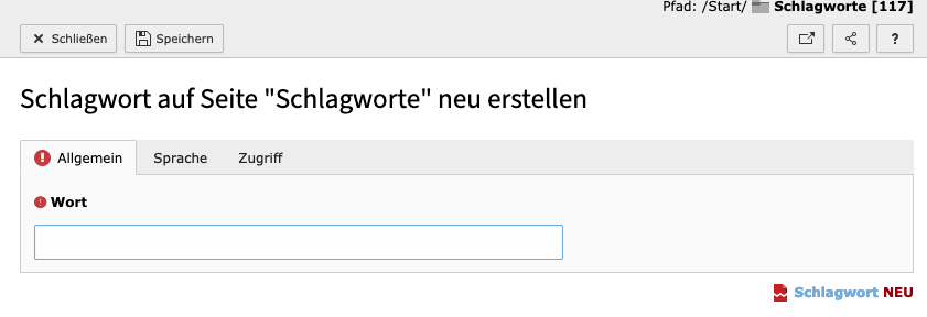 Für die Datensatzbasierten Module Publikationen und Projekte besteht die Möglichkeit, Schlagworte festzulegen, nach welchen gefiltert und gesucht werden kann. Alle Schlagworte sind zentral in dem Ordner "Schlagworte" gespeichert und können dort bearbeitet werden.
